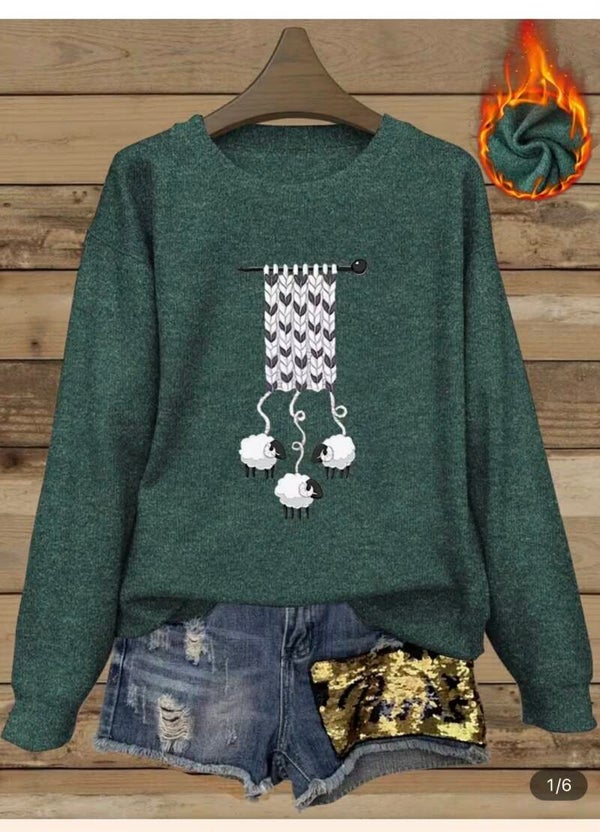 Chandail chaud avec imprimé motif amusant de moutons, col rond et manches longues, mignon, doux, chaud, se porte 4 saisons. 90% Polyester, 4% Élasthanne, 6% Viscose.