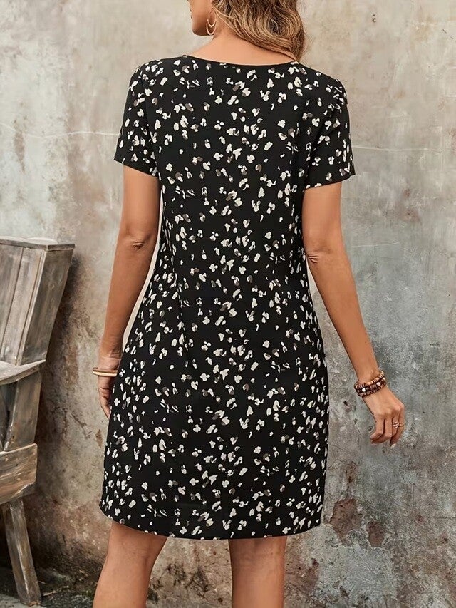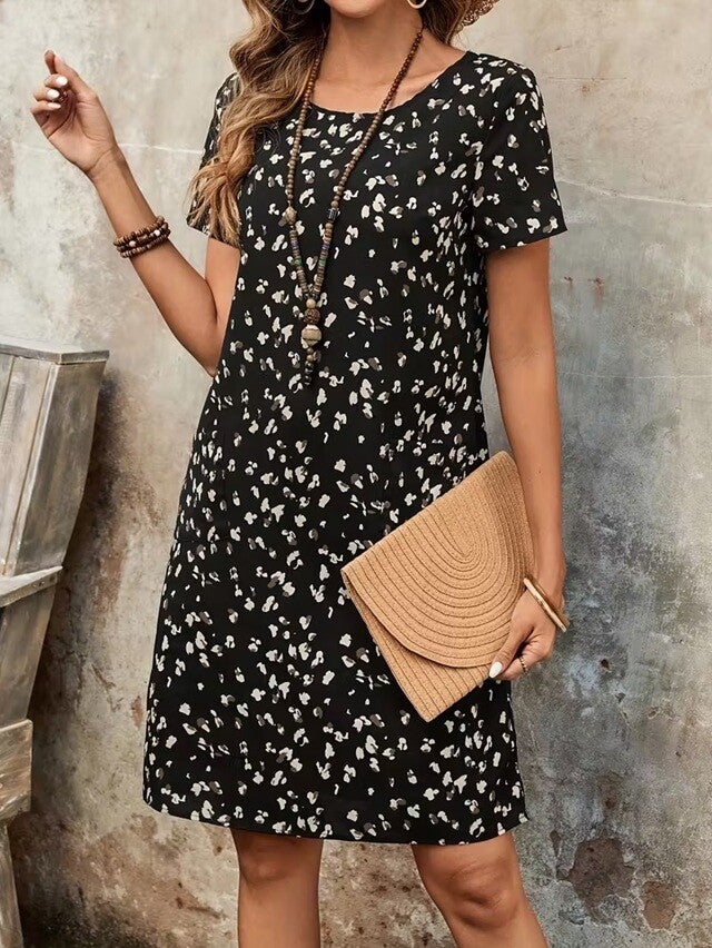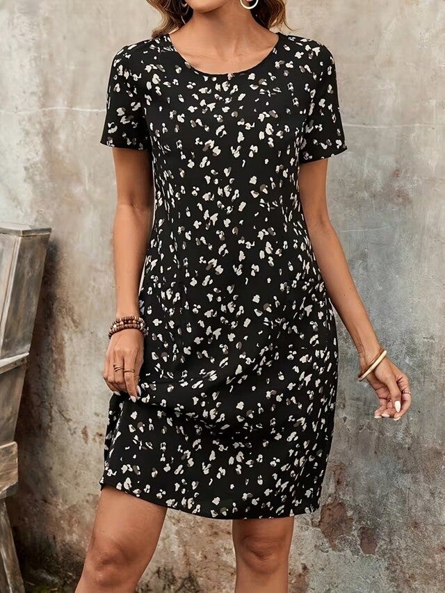Robe, à la fois décontractée et classique, manches courtes, col rond, lavable en machine, Tenue de Vacances Printemps-Été. 95% Polyester, 5% Élasthanne
