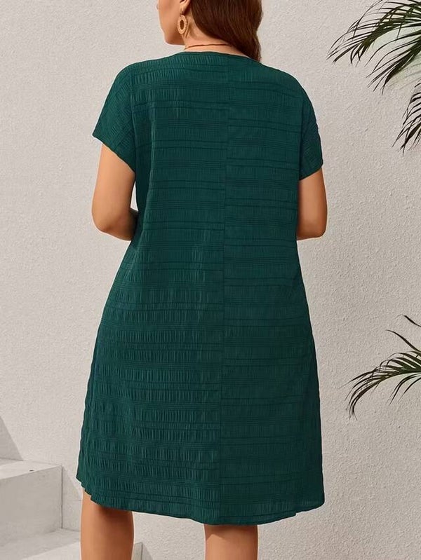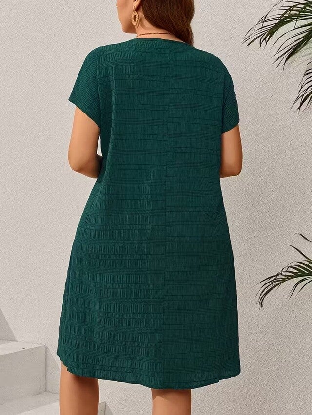 Robe de couleur tendance, à manches courtes, bien agencée elle peut se porter autant à un BBQ qu'à un souper des Fêtes. Polyester.