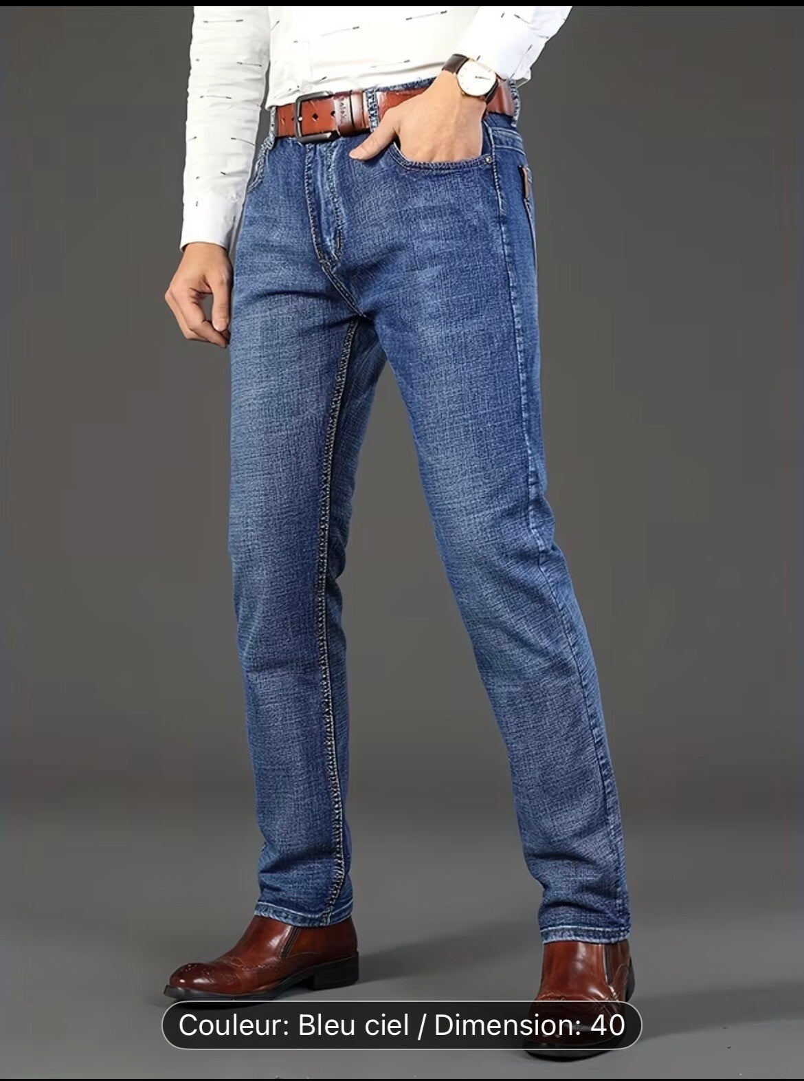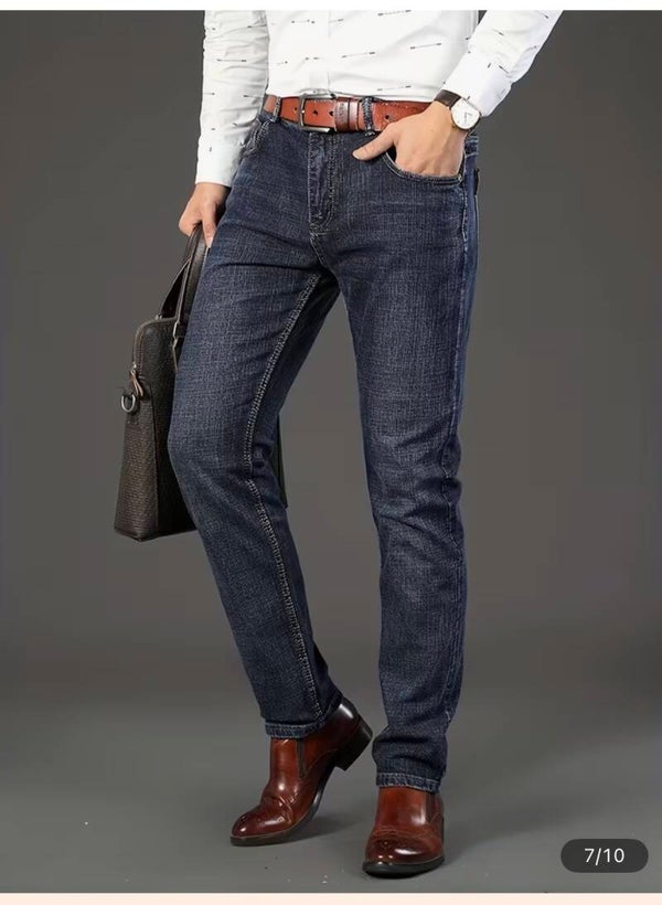 Jean classique, coupe régulière, droite, extensible, confortable et polyvalent. 65% coton 35% polyester.